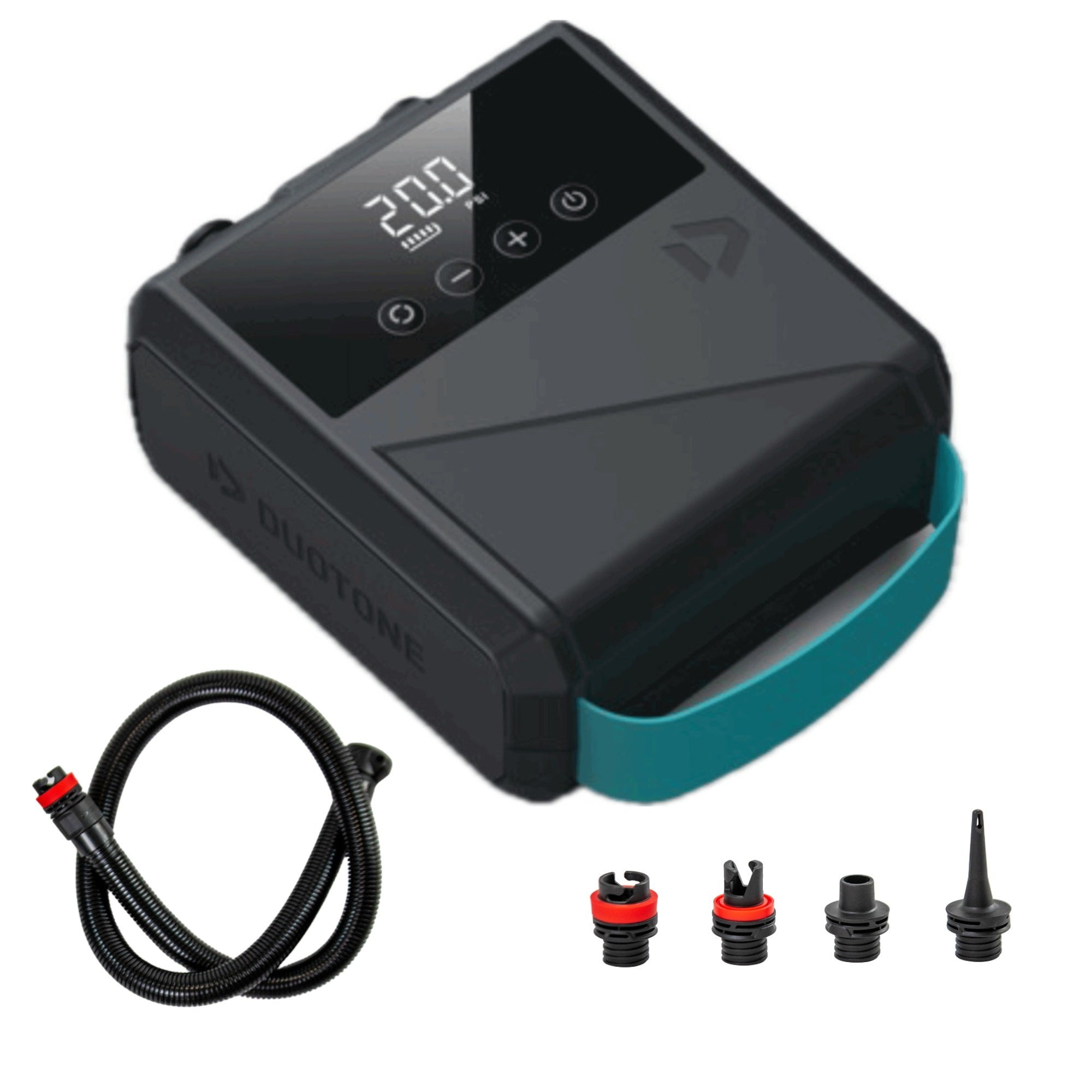 Power Up Faster, Ride Longer! The all-new Duotone Electric Air Pump delivers game-changing inflation performance for every watersport enthusiast. This compact powerhouse efficiently inflates your kites, wings, SUPs, and more, freeing you from the exhaustion of manual pumping so you can focus on what matters most – maximizing your time on the water! Are you ready to revolutionize your pre-session routine? Because that's exactly what the Duotone Lazepump delivers! With impressive output capacity and versatile compatibility across all inflatable equipment, this essential accessory represents the perfect balance of performance, portability, and precision. Experience unmatched convenience with the Electric Air Pump's powerful motor that delivers precise inflation up to 1.4 Bar (20 PSI), ensuring optimal rigidity for peak performance. The integrated filter system protects against sand and debris, significantly extending your pump's lifespan even in challenging beach conditions. Weighing just 1.3 kg, this lightweight companion easily fits in your gear bag without adding unnecessary bulk. The E-Pump's exceptional battery efficiency means you can inflate an impressive 10 kites (9m) to 10 PSI, 8 wings (5m) to 10 PSI, or 3-5 SUPs on a single charge. When it's time to power up, the quick 2-3 hour charging time ensures you're ready for your next session with minimal downtime. Designed for riders who demand both performance and convenience, the Duotone Lazepump is the ultimate addition to your equipment arsenal. Simply the best solution for efficient, precise inflation across your entire quiver.